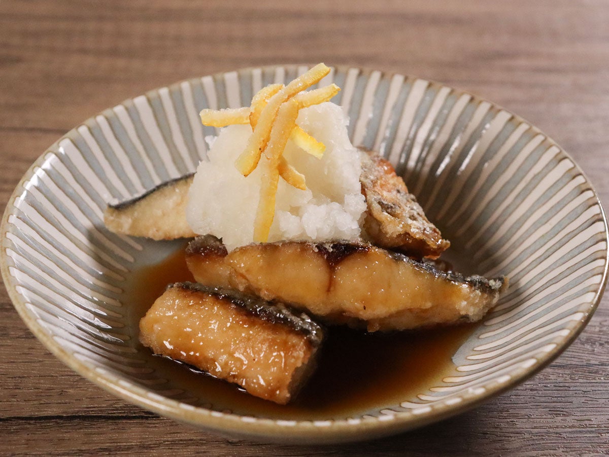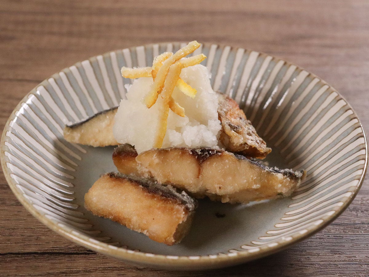 - 皿に盛り付けて、水切りした「大根おろし」、「刻み生ゆず」を乗せて「ゆずぽん」をかけて提供。