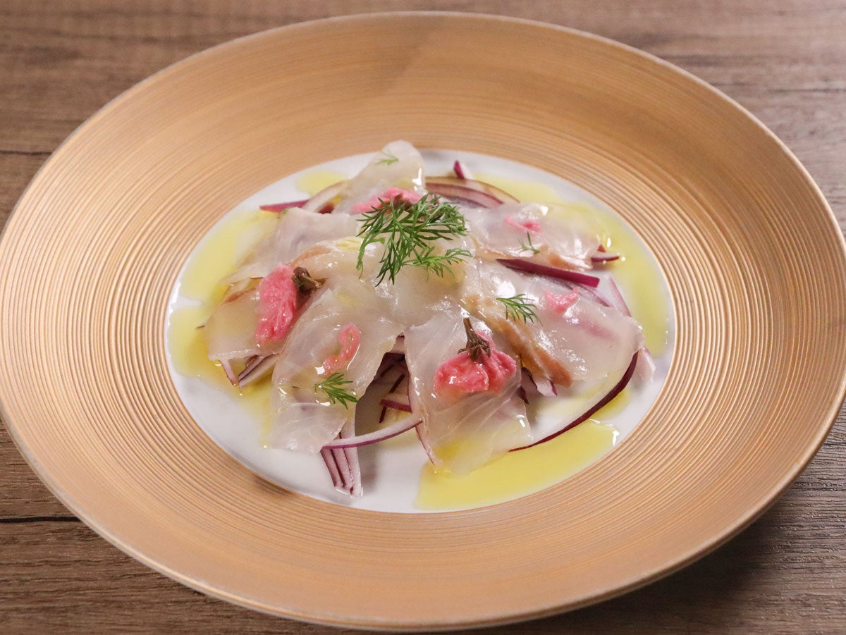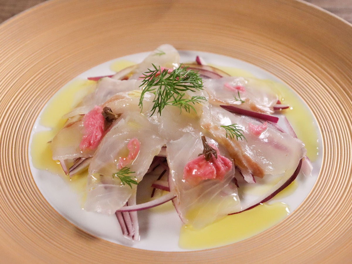真鯛と桜の花を使ったカルパッチョです。 桜の葉を使って締めると桜の香りが鯛に移り上品な香りと旨味が凝縮されます。