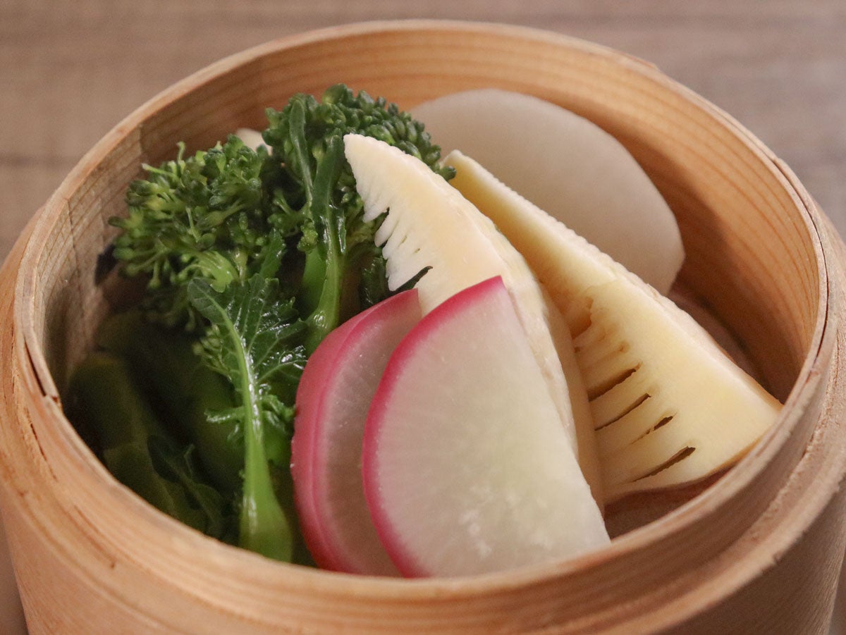 - せいろに「たけのこ穂先カット」「かぶ」「レディーサラダ」「スティックセニョール」を並べる。