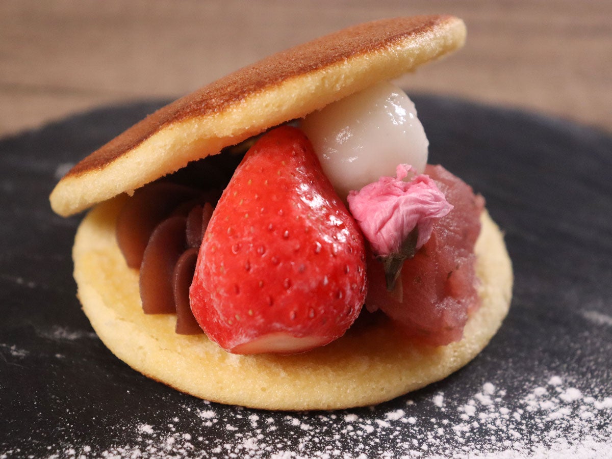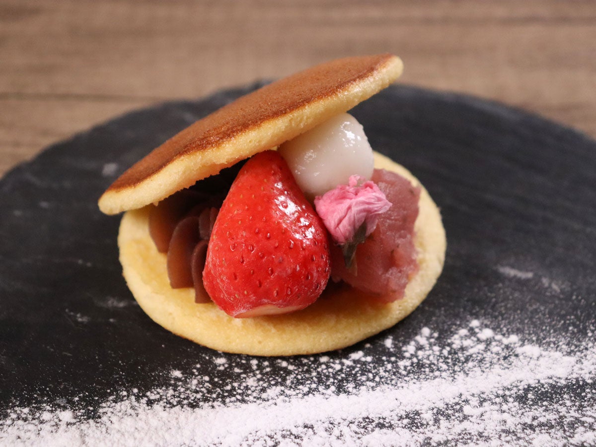 - 「あまおう」と「白玉」を乗せてもう1枚の「どら焼きの生地」を乗せて「桜の花」を添えて提供。