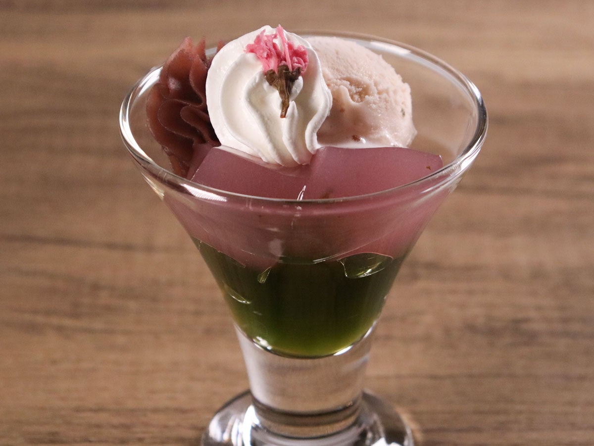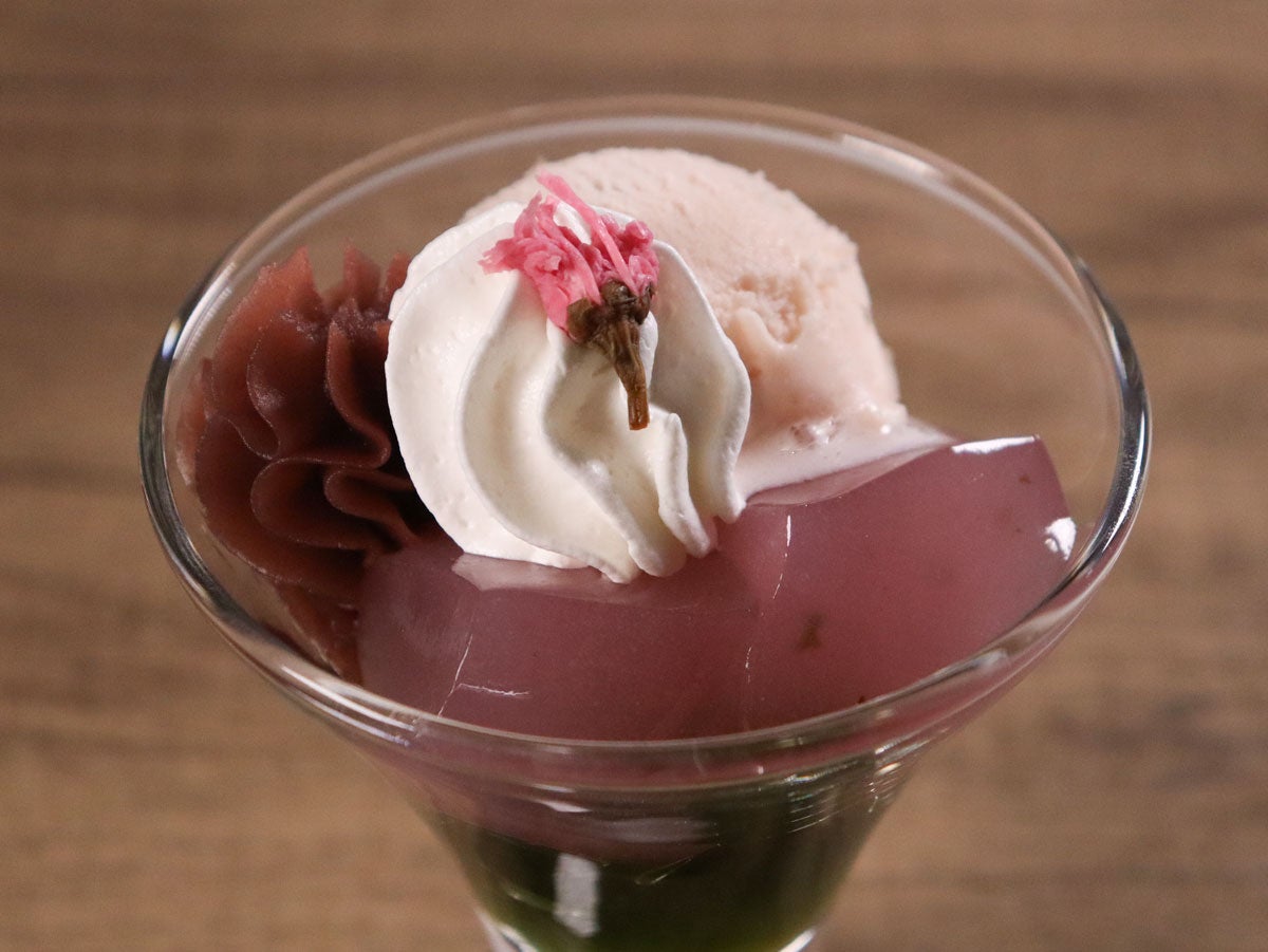 - グラスに「抹茶カットゼリー」とカットした「桜わらびもち」を入れる。