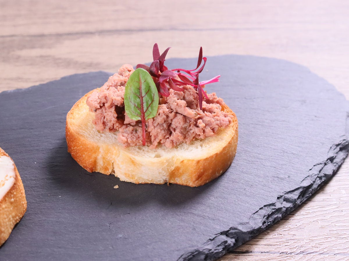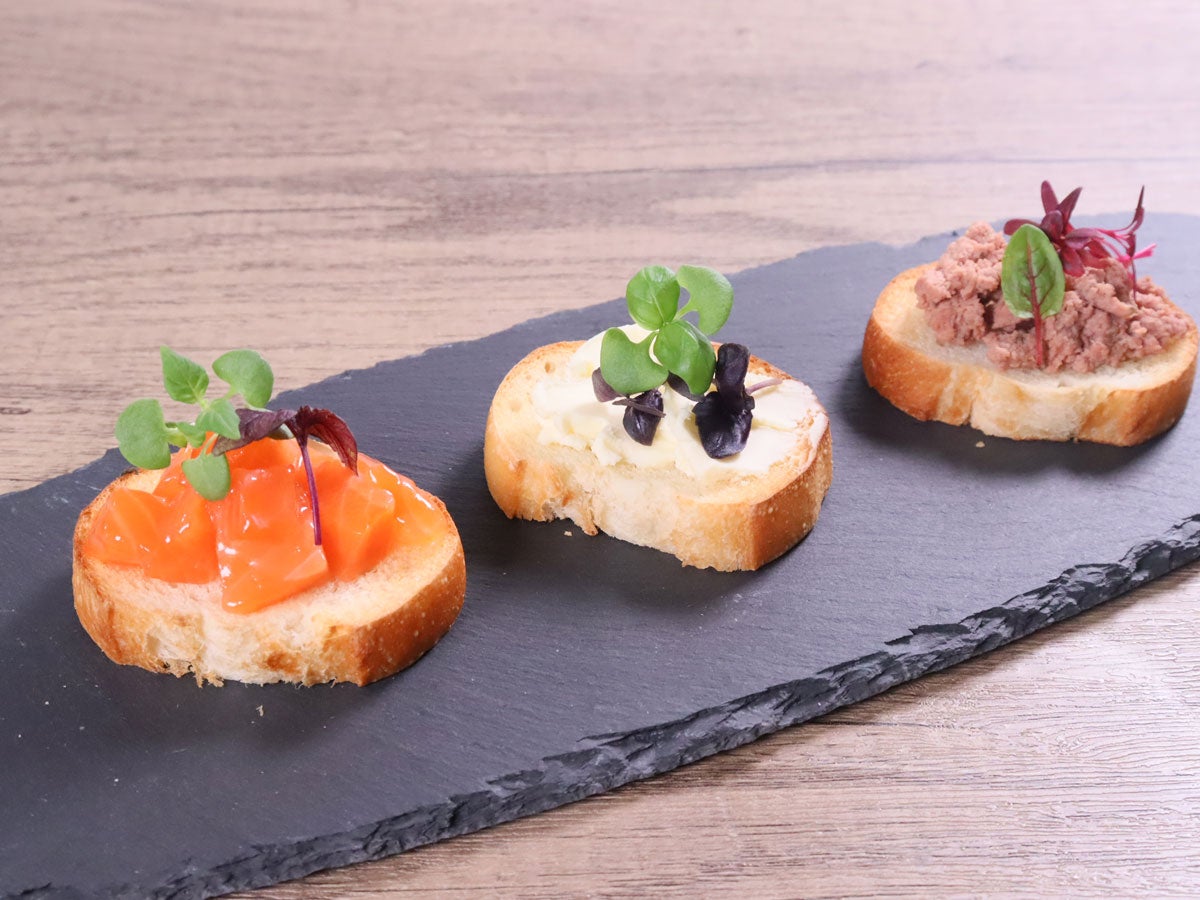 - トーストした「バゲット」に①、「クリームチーズの純米酒粕漬」、「北海道産豚のレバーペースト」を盛り付ける。