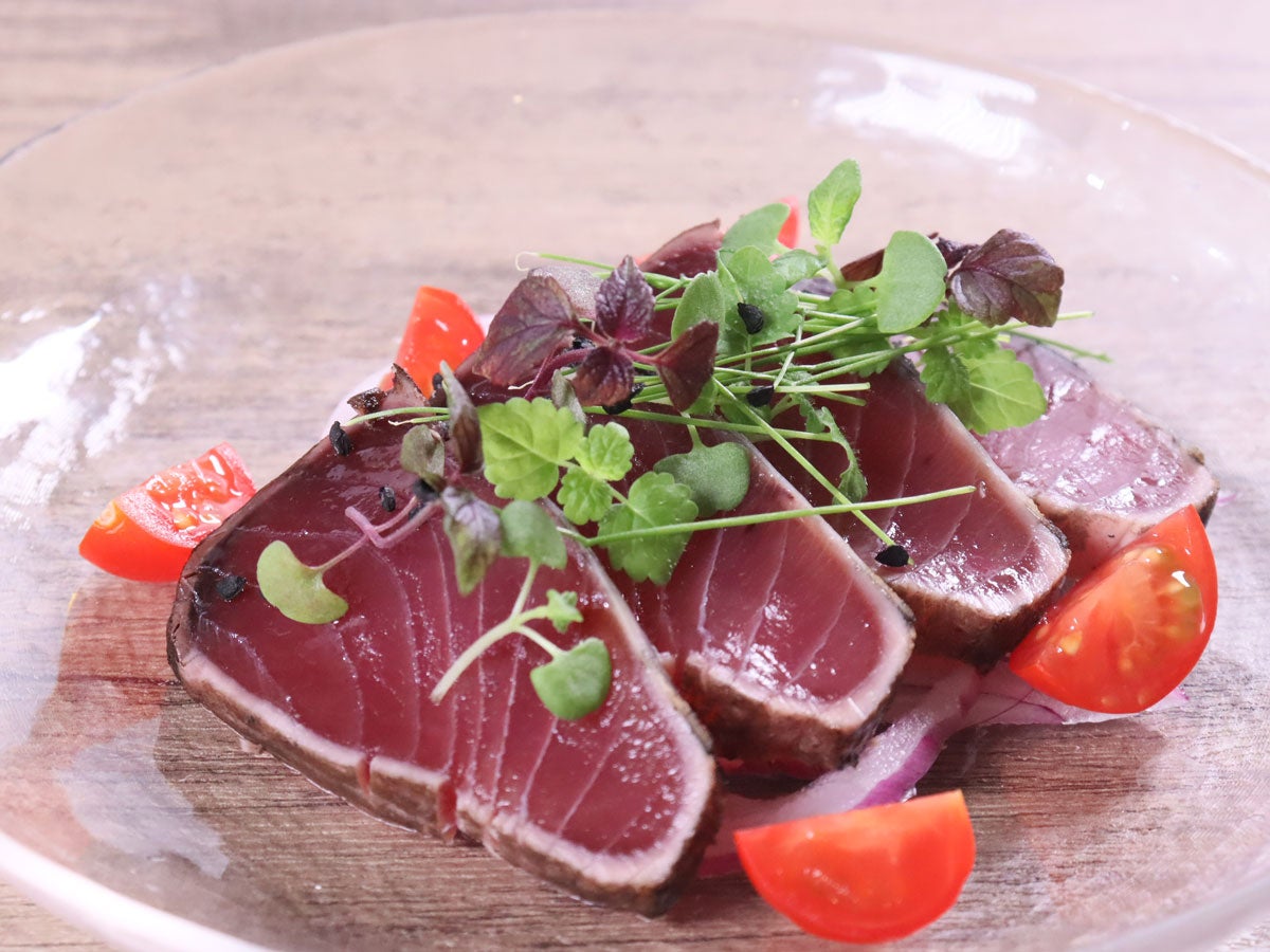 「鰹たたき」は約1皿分ずつ少量パックされているので、ロスなく提供することが可能です。また、タレも付いているので便利! 今回はマイクロハーブを使って華やかに仕上げました。 ミクリードでは、様々なマイクロハーブを取り扱っています。 ぜひ覗いてみてください♪