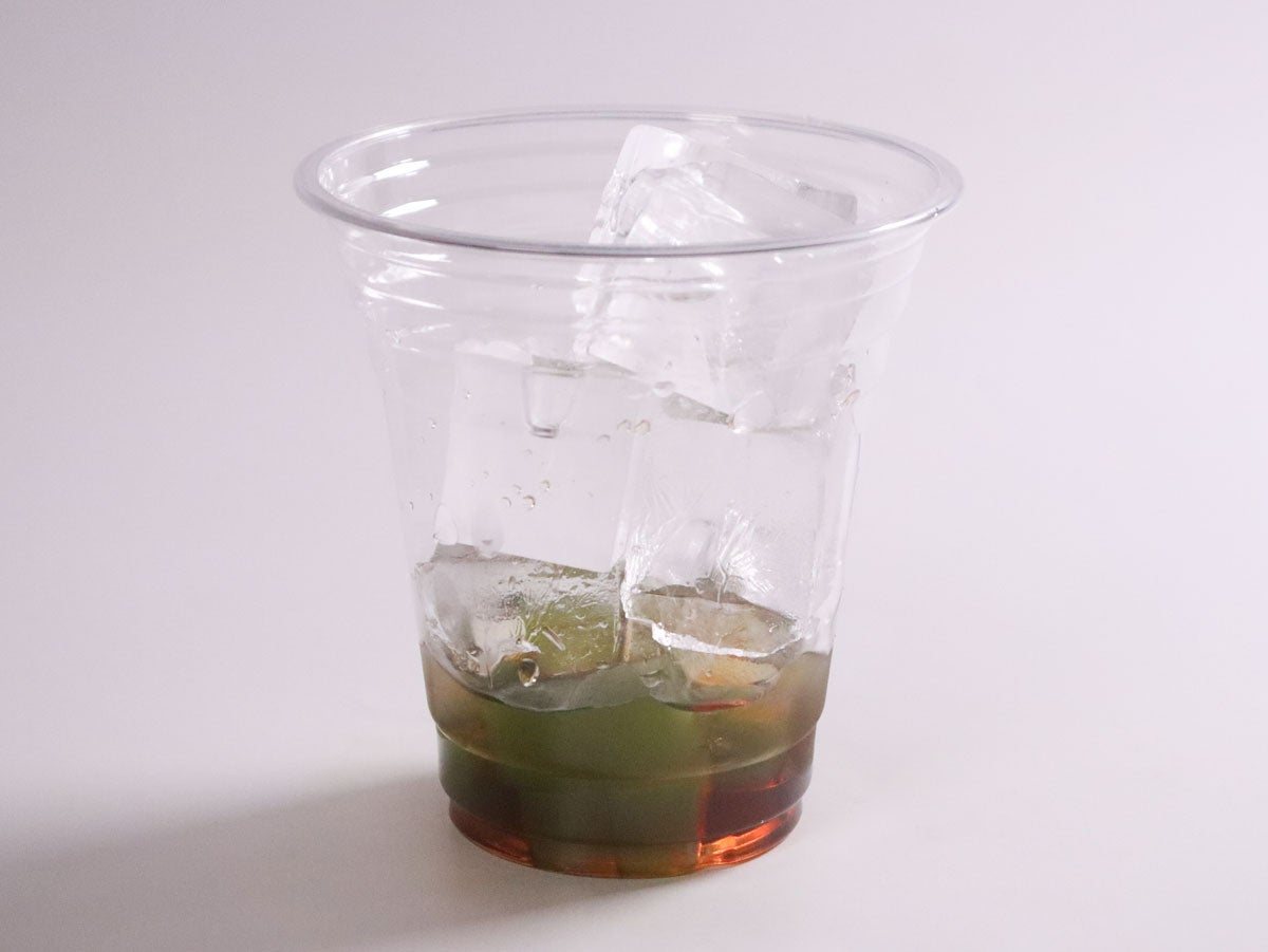 - カップに「抹茶ゼリー」と「さくらシロップ」、「氷」を入れる。