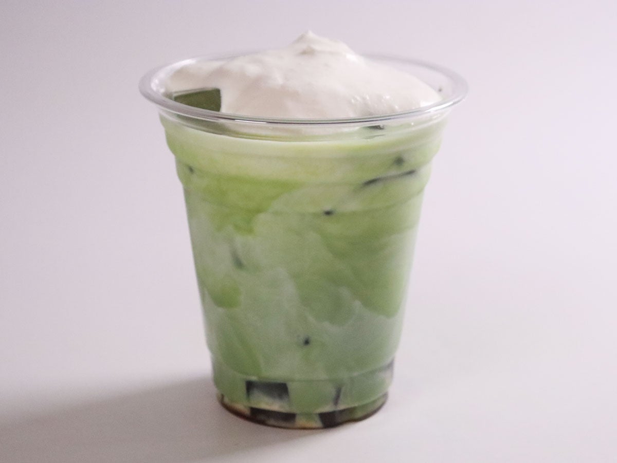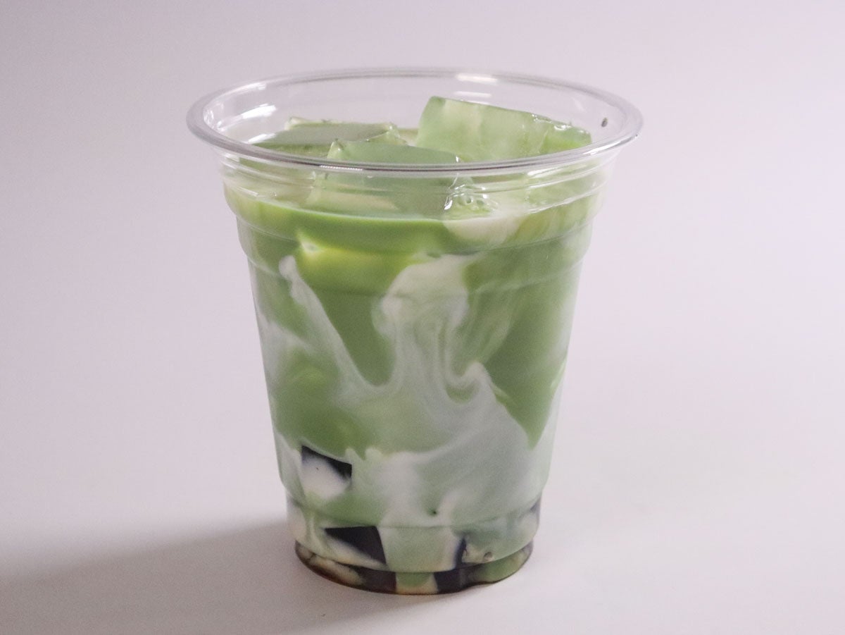抹茶ラテに黒糖ゼリーを入れた和風ドリンクです。 今回はグラデーションを出すために牛乳を入れましたが、抹茶ラテはストレートで使用できます! 黒糖ゼリーは個包装&カット済みで手軽に使えて便利♪ タピオカ用のストローを付けて提供がオススメ!