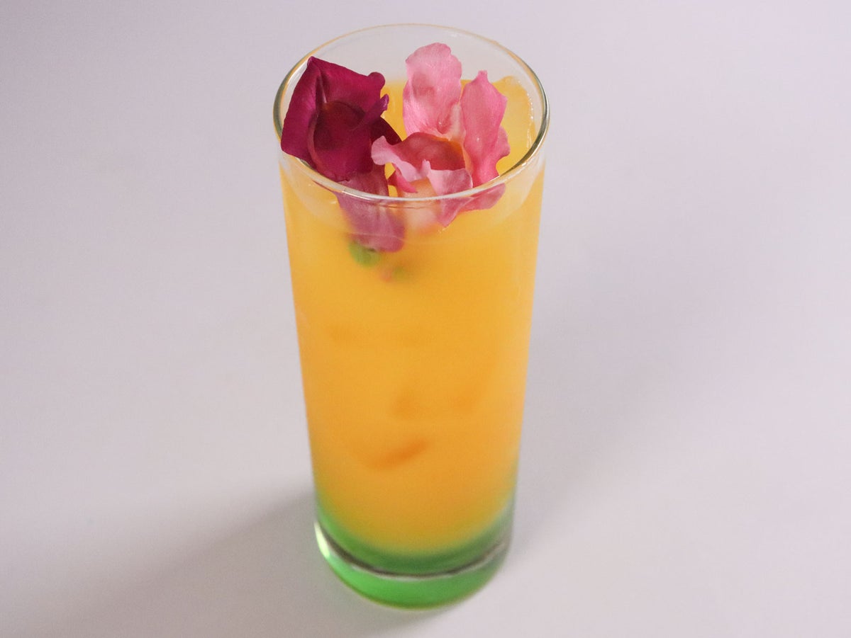 - ①に「オレンジジュース」を優しく注ぎ、「エディブルフラワー」を添えて提供。