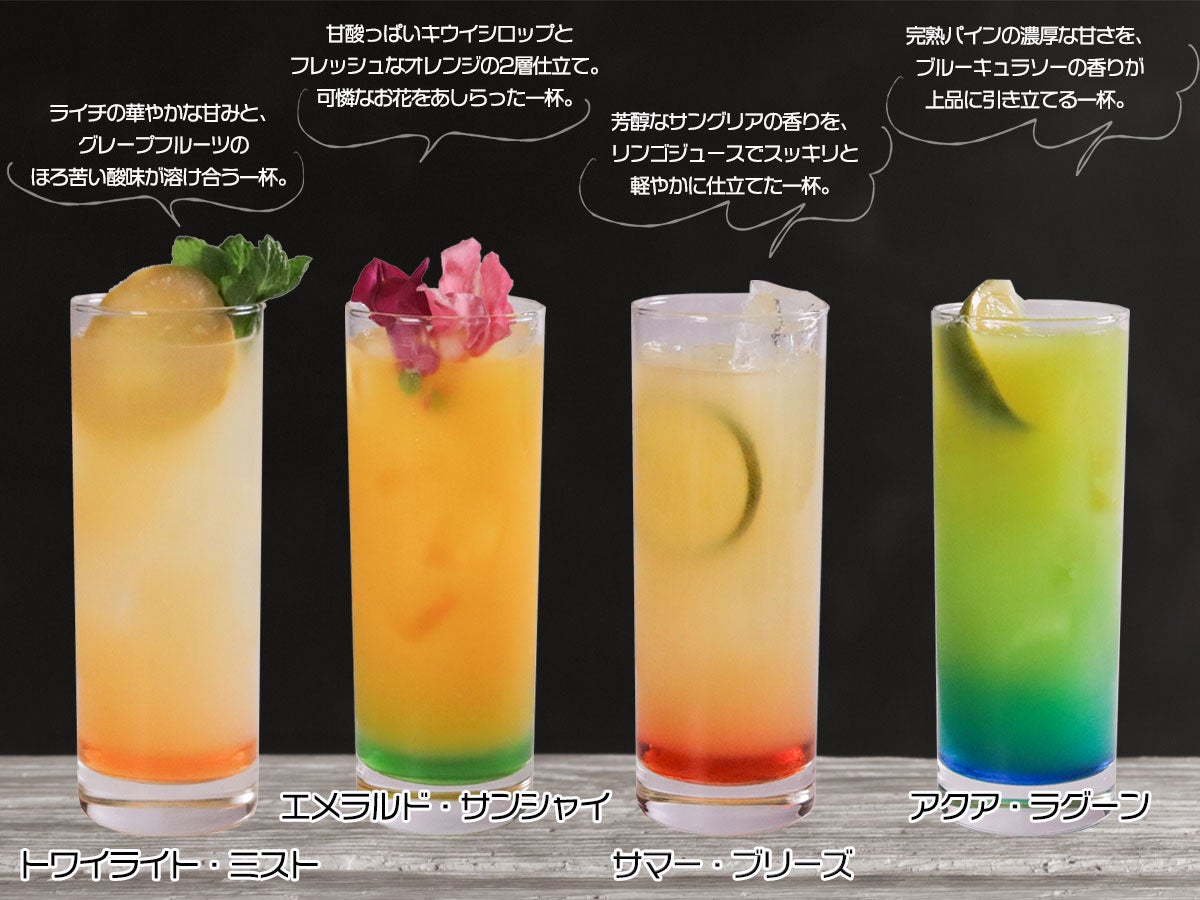 甘酸っぱいキウイシロップとフレッシュなオレンジの2層仕立て。 可憐なお花をあしらった、目にも鮮やかなノンアルコール・カクテルです。 爽快感あふれるフルーティーな味わいをお楽しみください。
