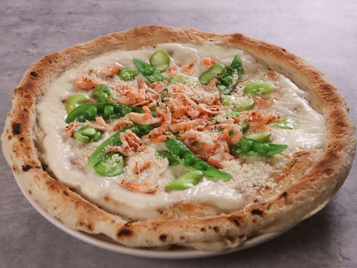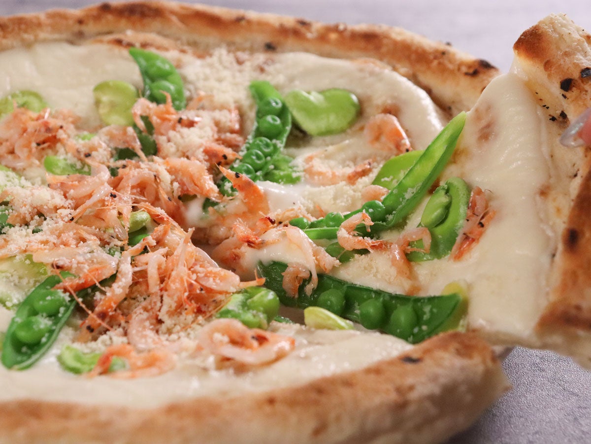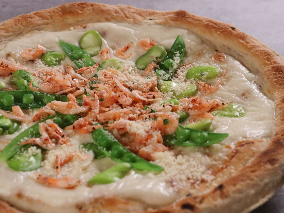 今が旬の桜えび、あまさや(スナップエンドウ)、そらまめをふんだんにのせた、春爛漫のクリームピザです。ベースの生地は冷凍ながら、本格的な窯焼きの香ばしさが特徴。とろ~り濃厚なクリームソースは絞り出しタイプを使用。必要な分だけサッと使えて便利です。