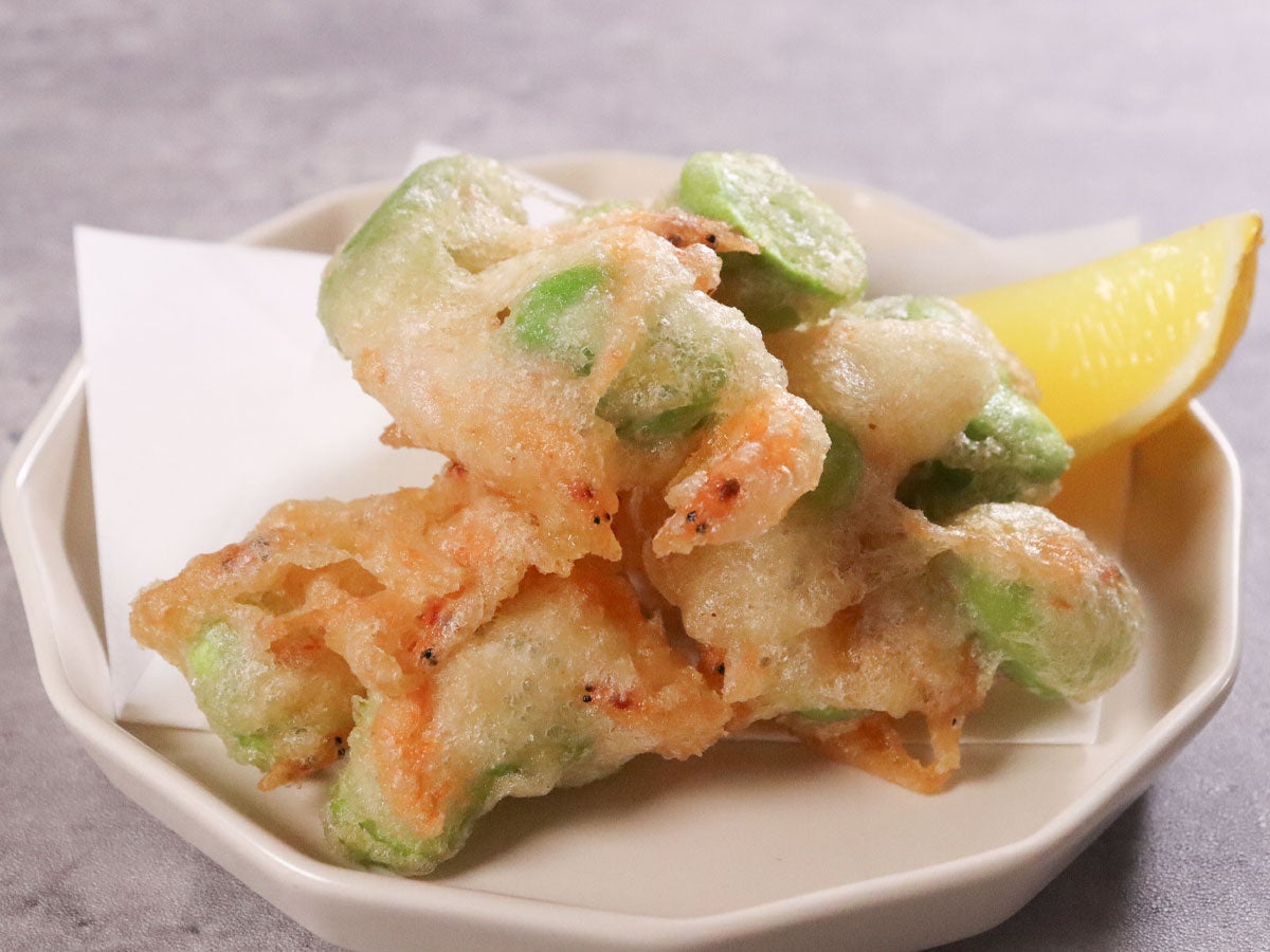 - 「フリッターミックス」をボールに入れ、「水」で溶き、「釜あげ桜えび」と「そらまめ」をくぐらせて揚げる。