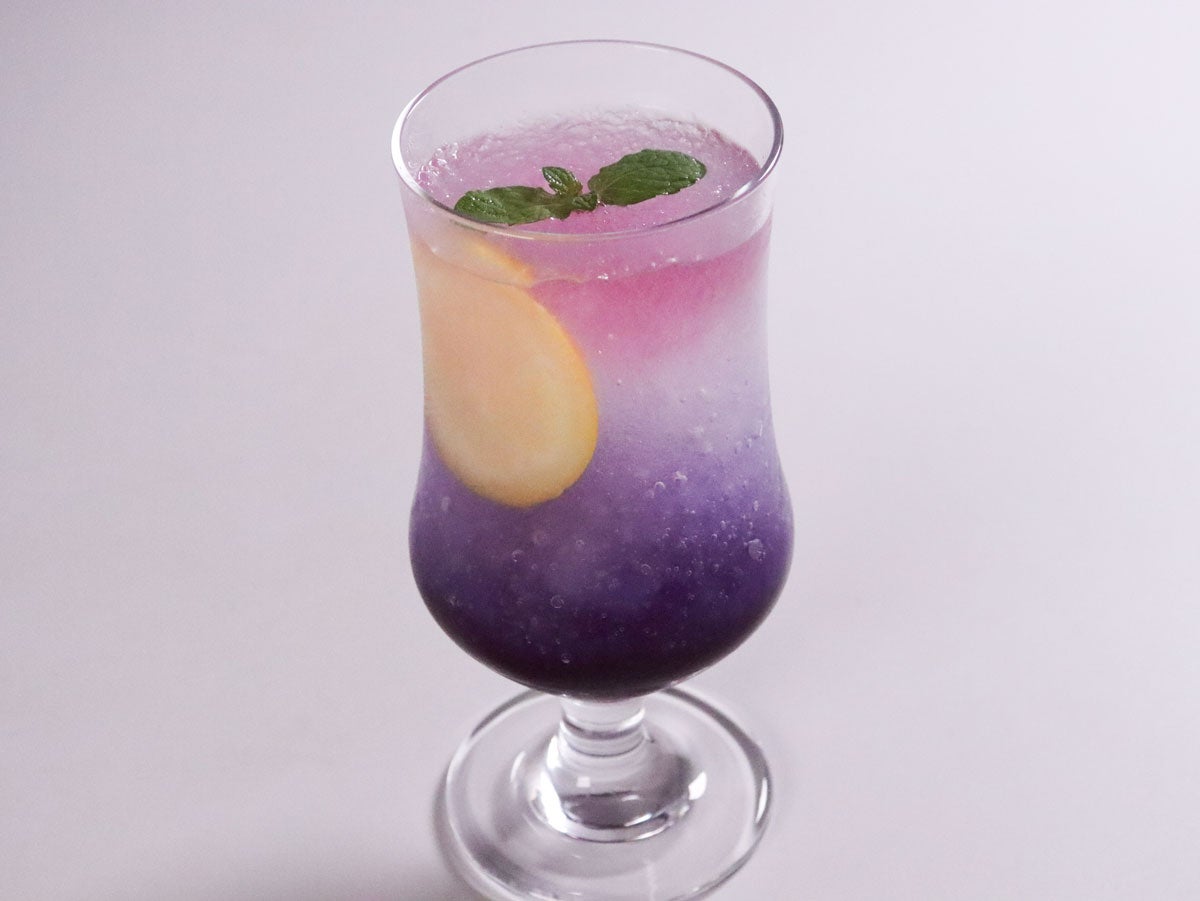 - 別で「バタフライピーシロップ」に「レモンシロップ」を入れて色を変えて②の上にかける。