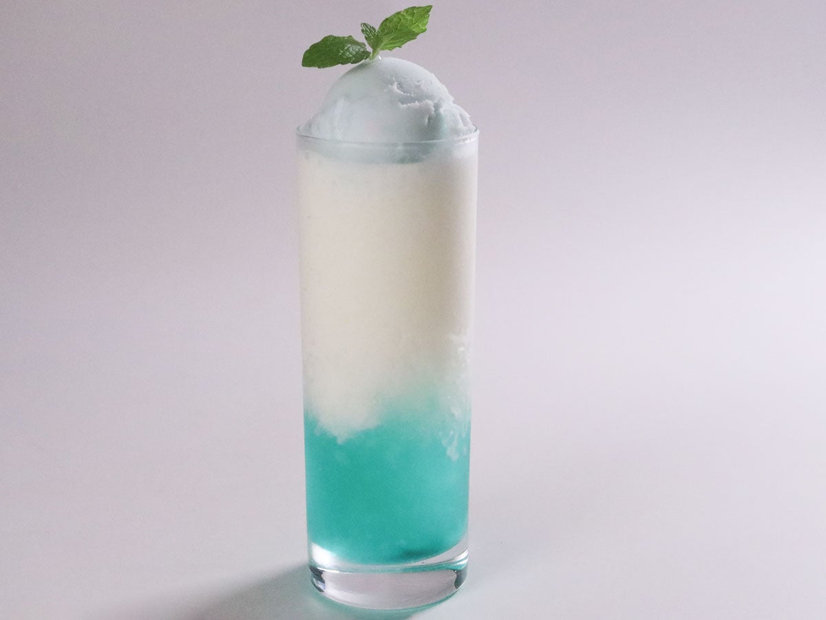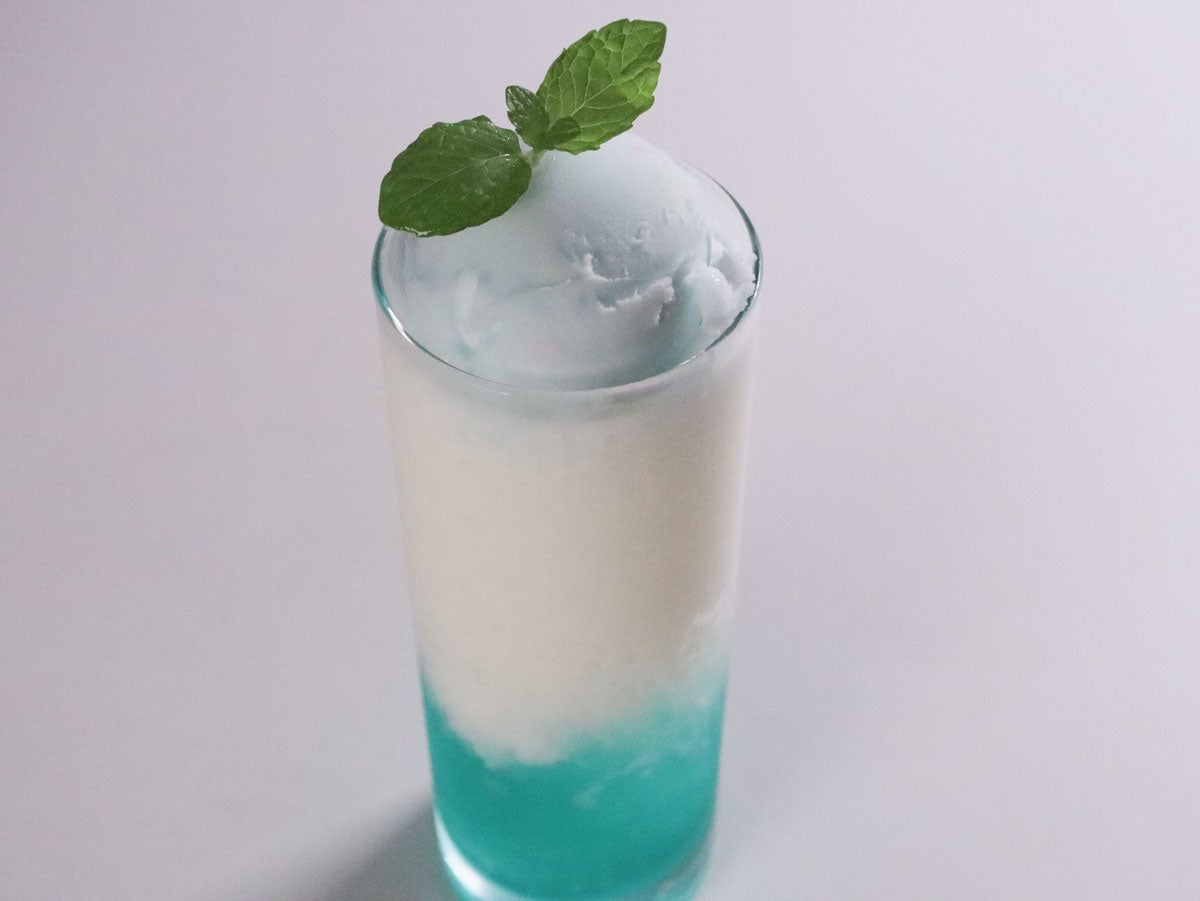 「飲むかき氷」! シャリシャリの冷たいかき氷をアマレットシロップで杏仁風味にしました。 青と白のコントラストが美しい1杯です。 デザートみたいな満足感のある新感覚ドリンク、ぜひ体験してください!