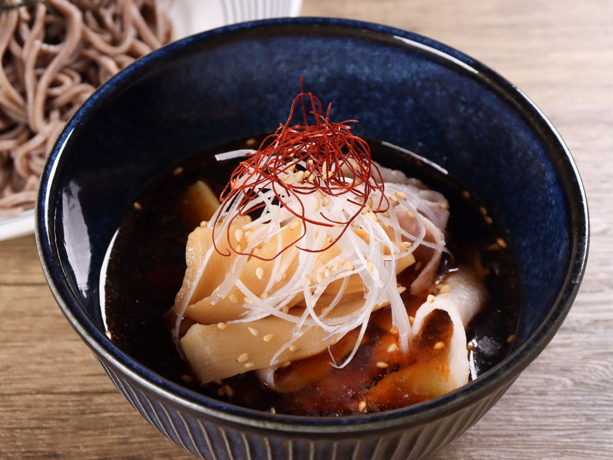 ラー油入りのそばつゆを使ったつけそばです。 つゆには豚肉とメンマをプラスして食べ応えのあるメニューにしました。