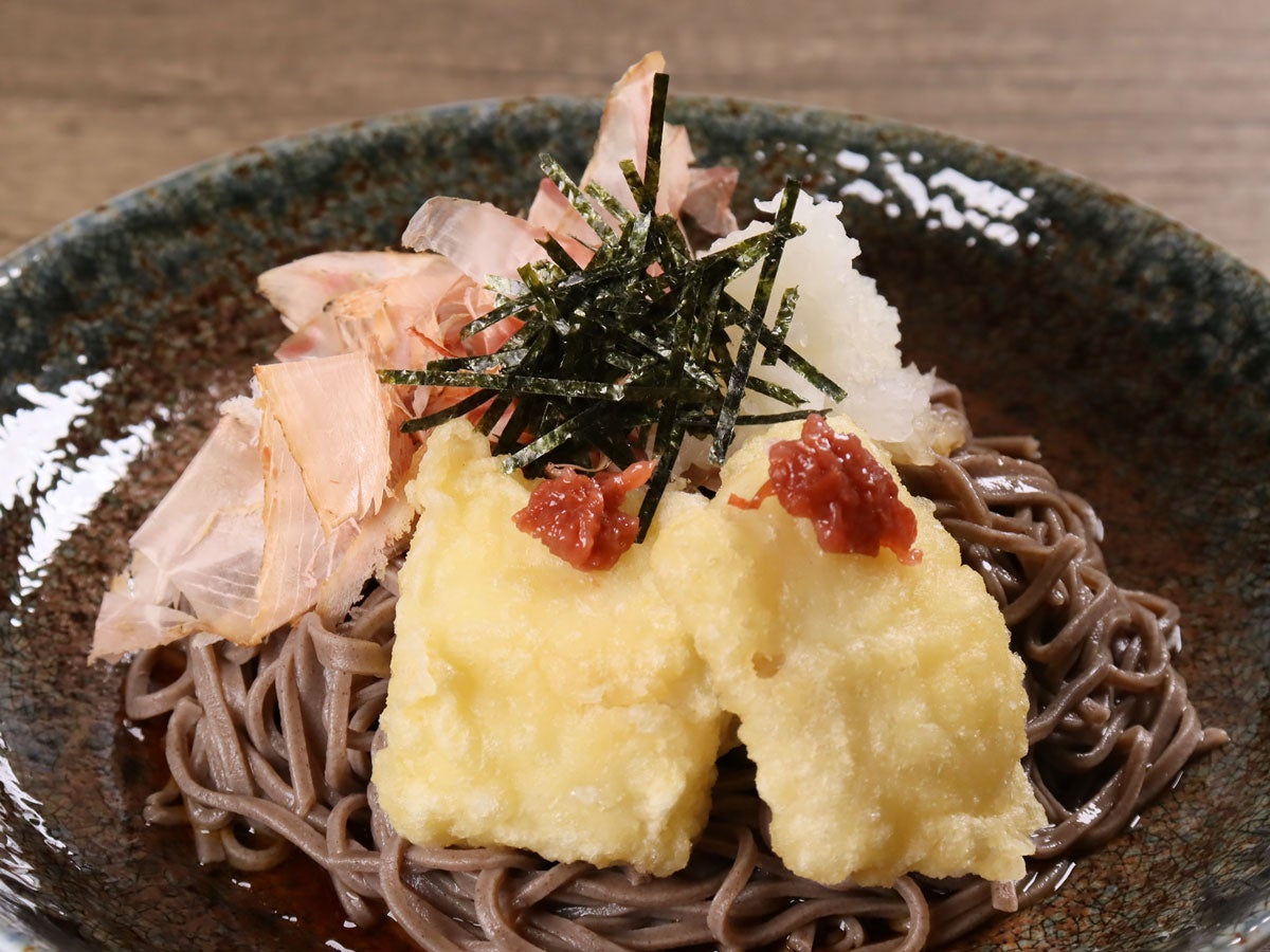 - 天ぷらの上に「練り梅」をトッピングして、「花かつお」「きざみのり」も乗せる。