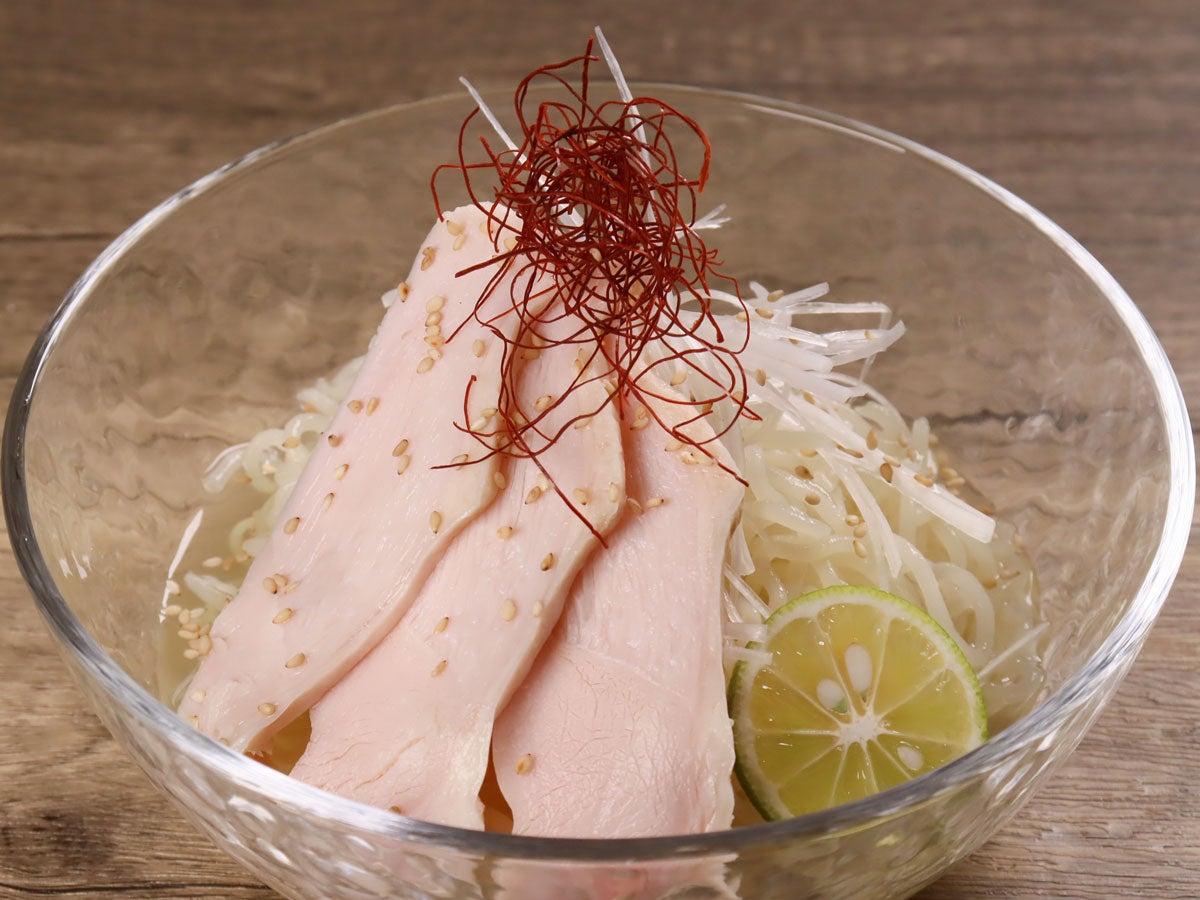 ゆず塩スープで食べるさっぱり冷麺です。 トッピングに使用した蒸し鶏は、鶏むね肉を低温真空調理する事でパサつかず、鶏むね肉でも驚くほどのジューシーなしっとりしています。 夏麺の変わり種メニューにいかがですか?
