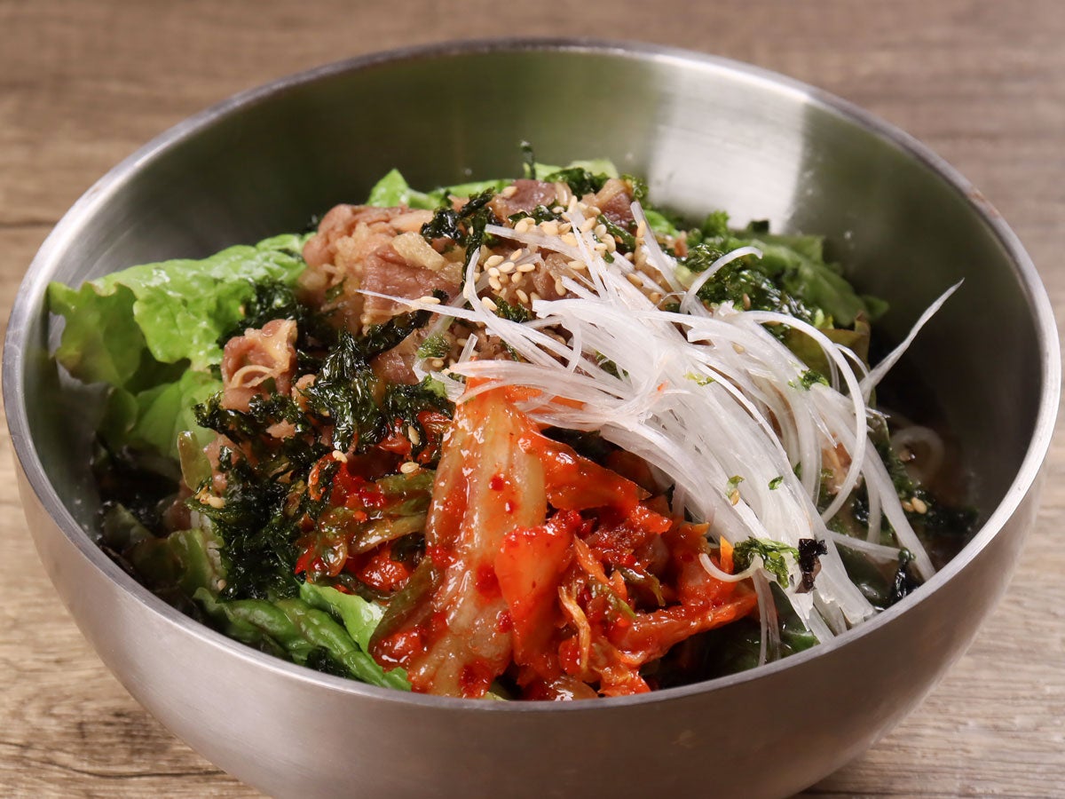 シャキシャキの生野菜に、甘辛いタレで仕上げたお肉をどっさり乗せました。 旨辛キムチと韓国海苔の風味がアクセントになって、最後まで飽きずにツルッといけちゃいます。