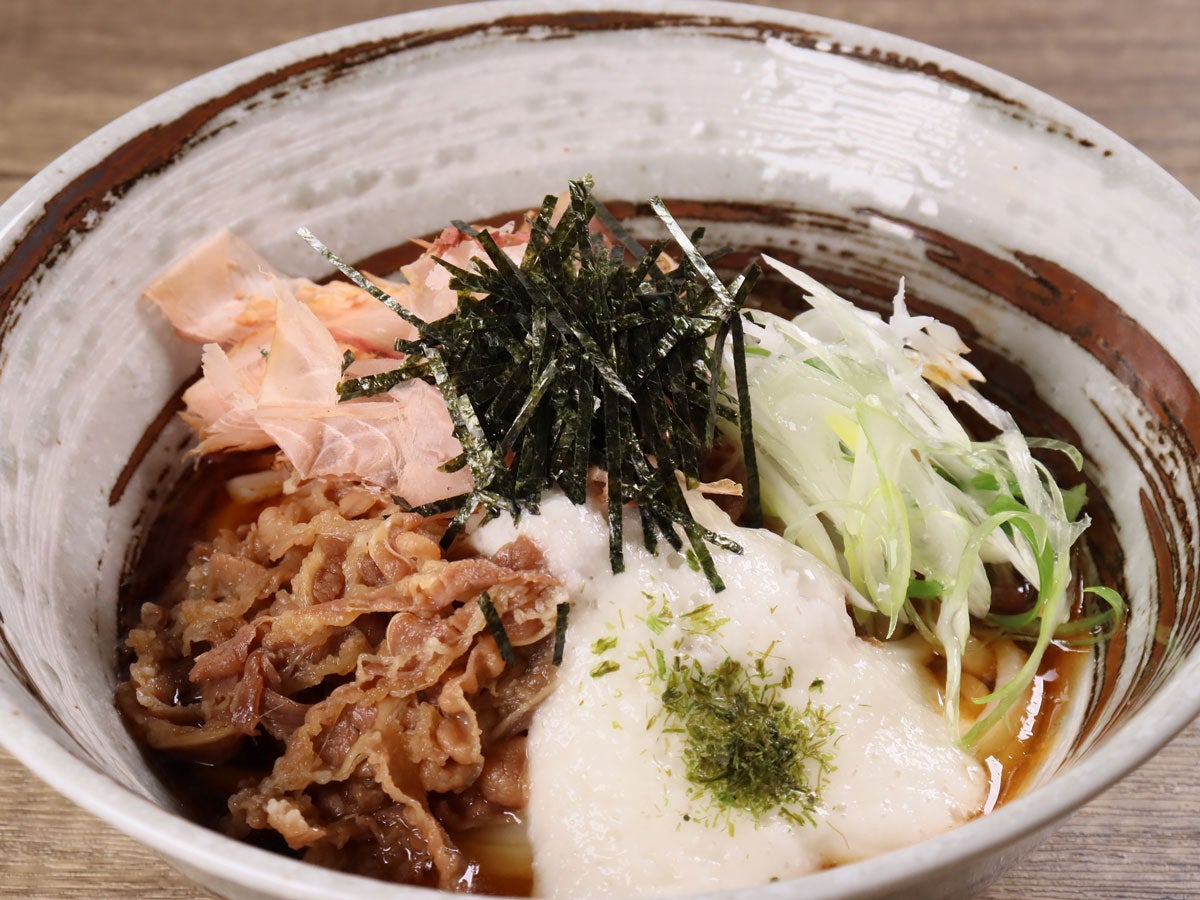 味付きの牛肉ととろろを乗せた冷たいうどんです。 つゆに使用した「冷たいラー油肉そばのつゆ」はラー油入りでお肉との相性抜群です。 下処理や扱いが大変なとろろも、個食パックを使えば手軽に提供可能です。