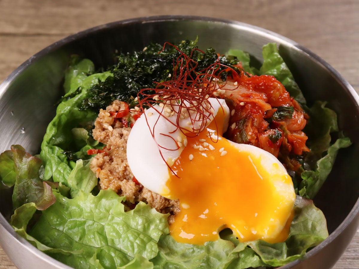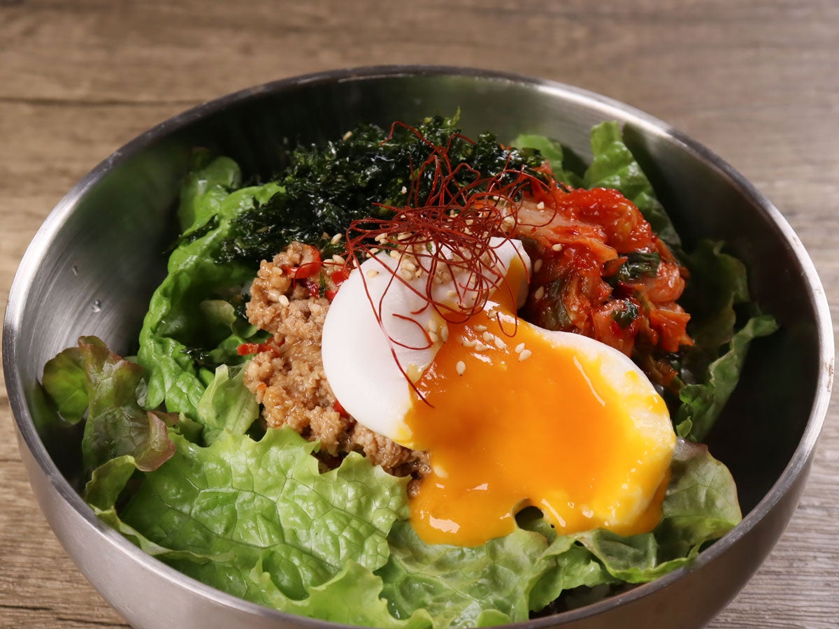 - 器に「ふんわりごはん」「サニーレタス」「旨辛豚ミンチ」「白菜キムチ」の順で盛り付ける。