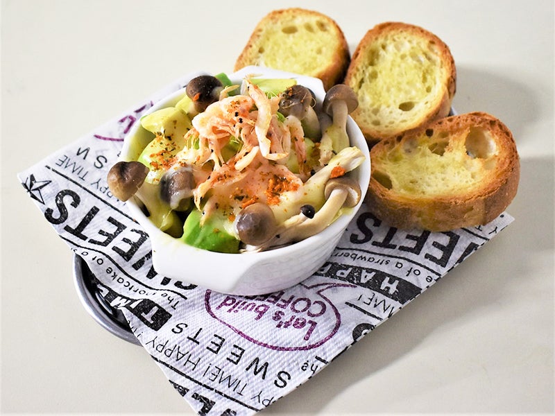 - 耐熱皿に、解凍した「グラタンソース」、2cm角に大き目にカットした「アボカドハーフ」と「しめじ」を入れる。