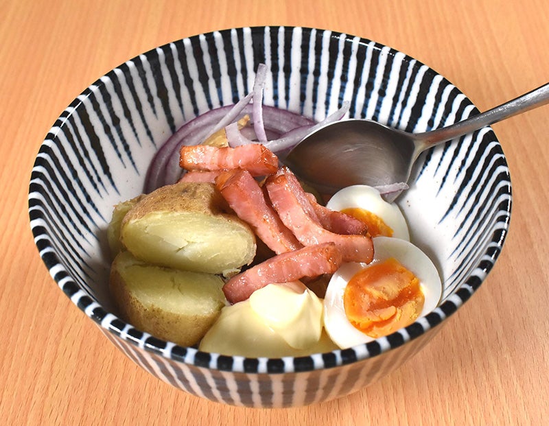 - 沸騰後、6分茹でた卵の殻を剥いておき、耐熱容器に「蒸しじゃが」と「拍子切りベーコン」を入れ、それぞれレンジで温めておく。