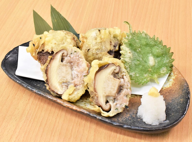 しいたけの肉詰めを、炭酸系のお酒のおつまみに合うように天ぷらに仕上げました。