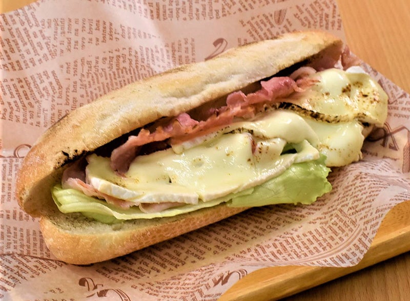 - 解凍済の「カスクート」を軽くトーストしておき、「粒マスタード」、カットした「レタス」、「カマンベールチーズ」、レンジで加熱した「ベーコン」をサンドする。