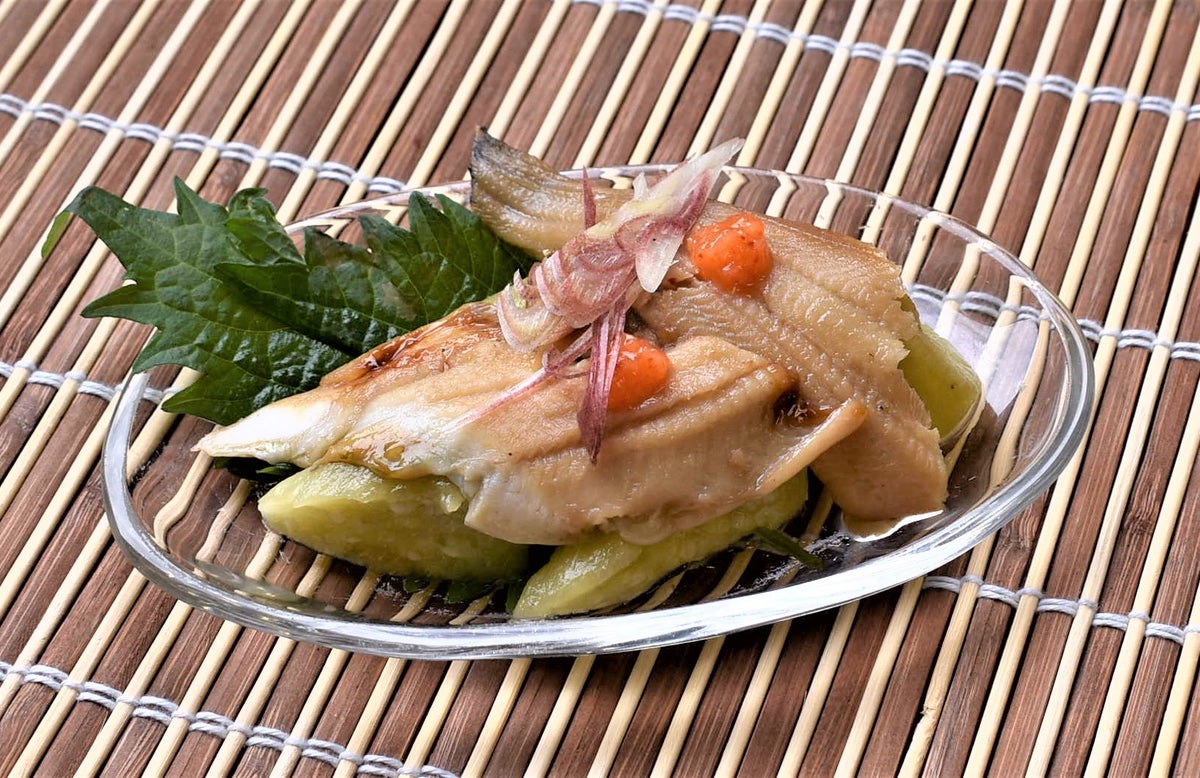 ‘焼きなす‘と柔らかい‘ふわふわあなご‘の冷菜です。お通しにもぴったりです。