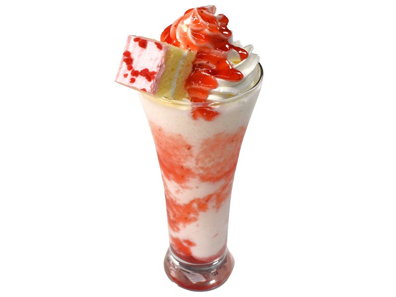 - グラスの側面部分に「ストロベリーソース」を回し入れ①.を注ぐ。