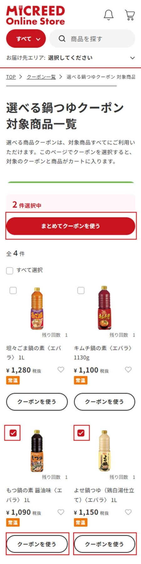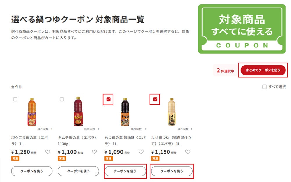 対象商品一覧ページで「クーポンを使う」ボタンを選択するか、使用する商品にチェックを入れて「まとめてクーポンを使う」ボタンを選択してください。