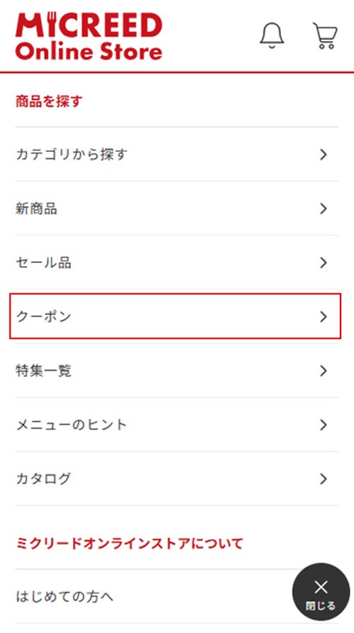 ヘッダーの「クーポン」(スマートフォンは、画面右下の「メニュー」→「クーポン」)からクーポン一覧ページを開く。
